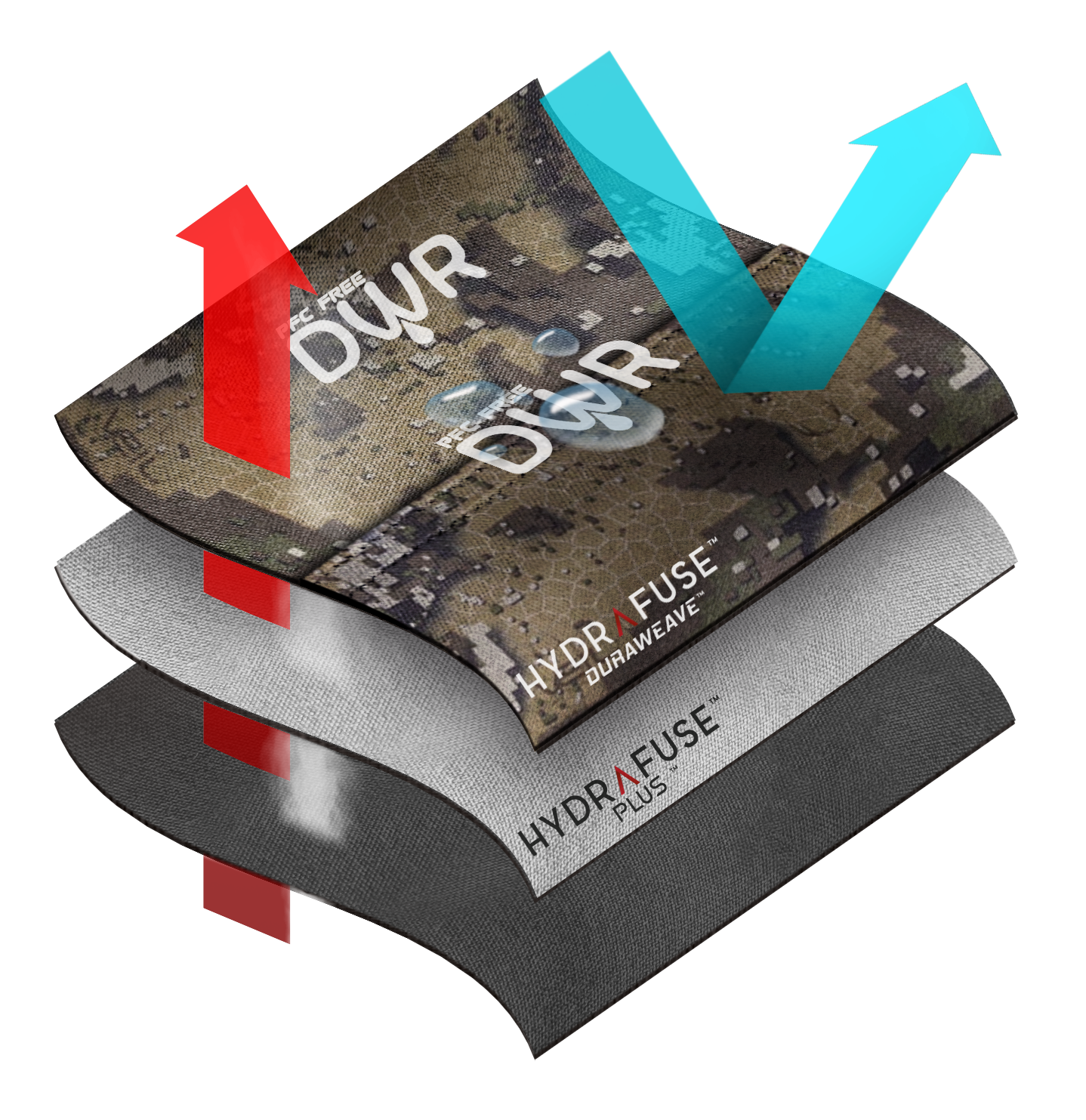 • HYDRAFUSE™ DURAWEAVE™ fabric is incredibly durable, waterproof, quiet, packable, and remains breathable.