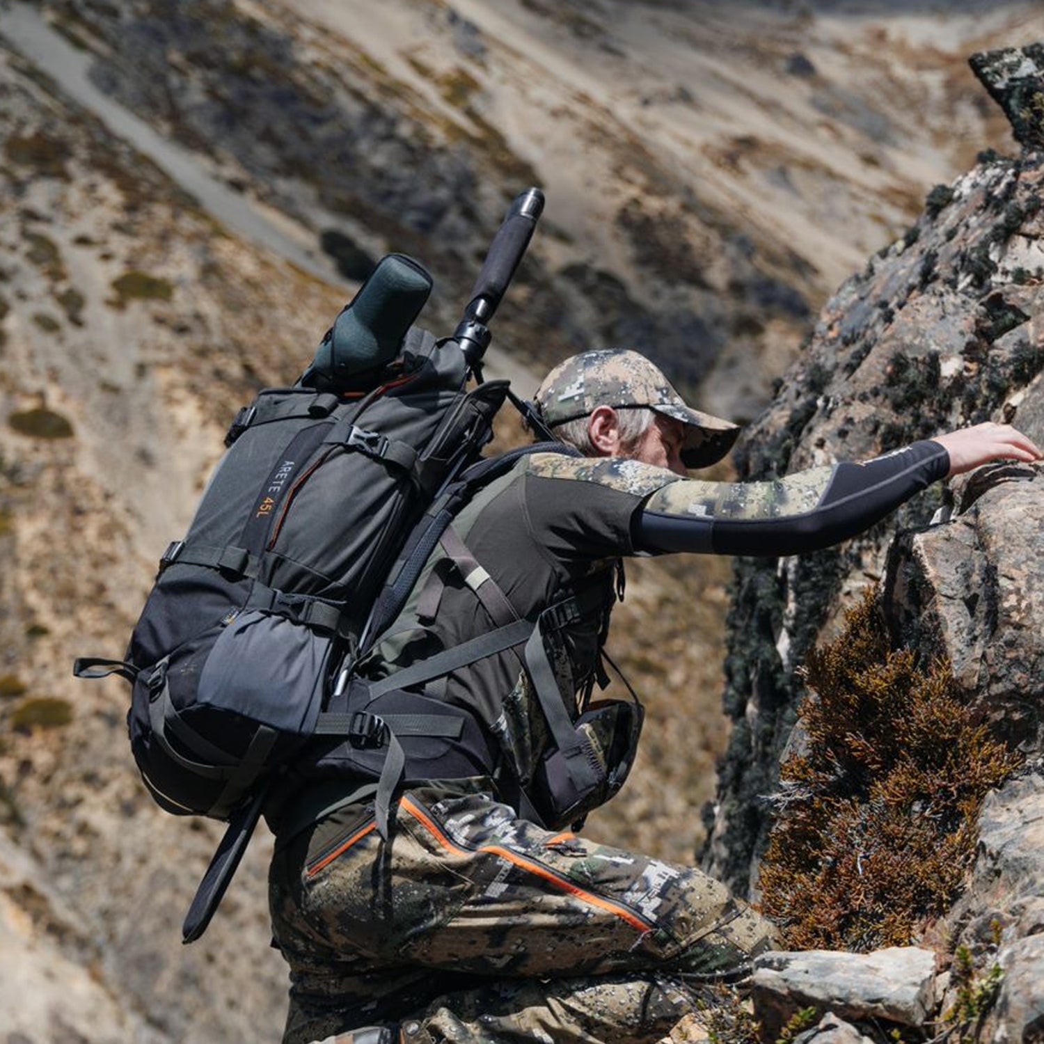 The integrated rifle scabbard can accommodate almost all hunting rifle lengths, sizes and barrel widths up to that of a standard magnum suppressor. The placement of the scabbard closer to your body keeps weight distribution optimal and minimises extra motion from your pack while on the move and is quick access so you won't miss a chance to take the shot.