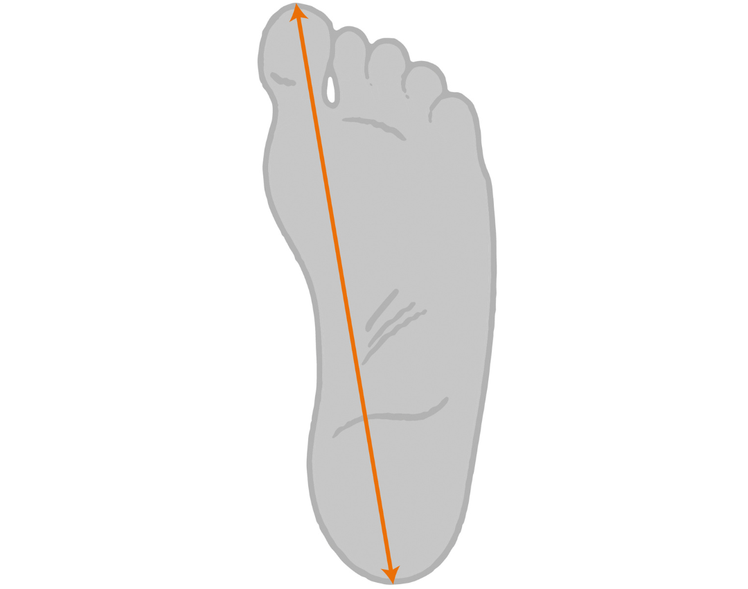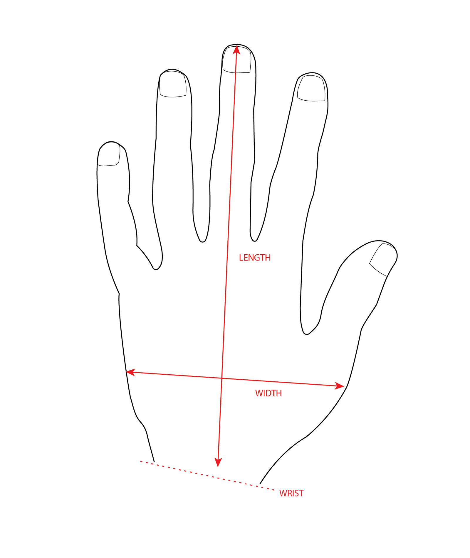 Lay your hand flat on a solid, even surface. Refer to the image below and measure the length (from the tip of your middle finger to the base of your palm) and the width (across the widest part of your palm).