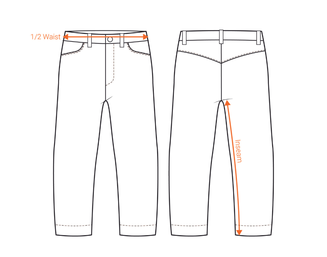 Lay your favourite pants flat on a solid even surface. Refer to the image below and measure the waist, hip and inseam. Compare to your desired pants size chart to find your best fit.