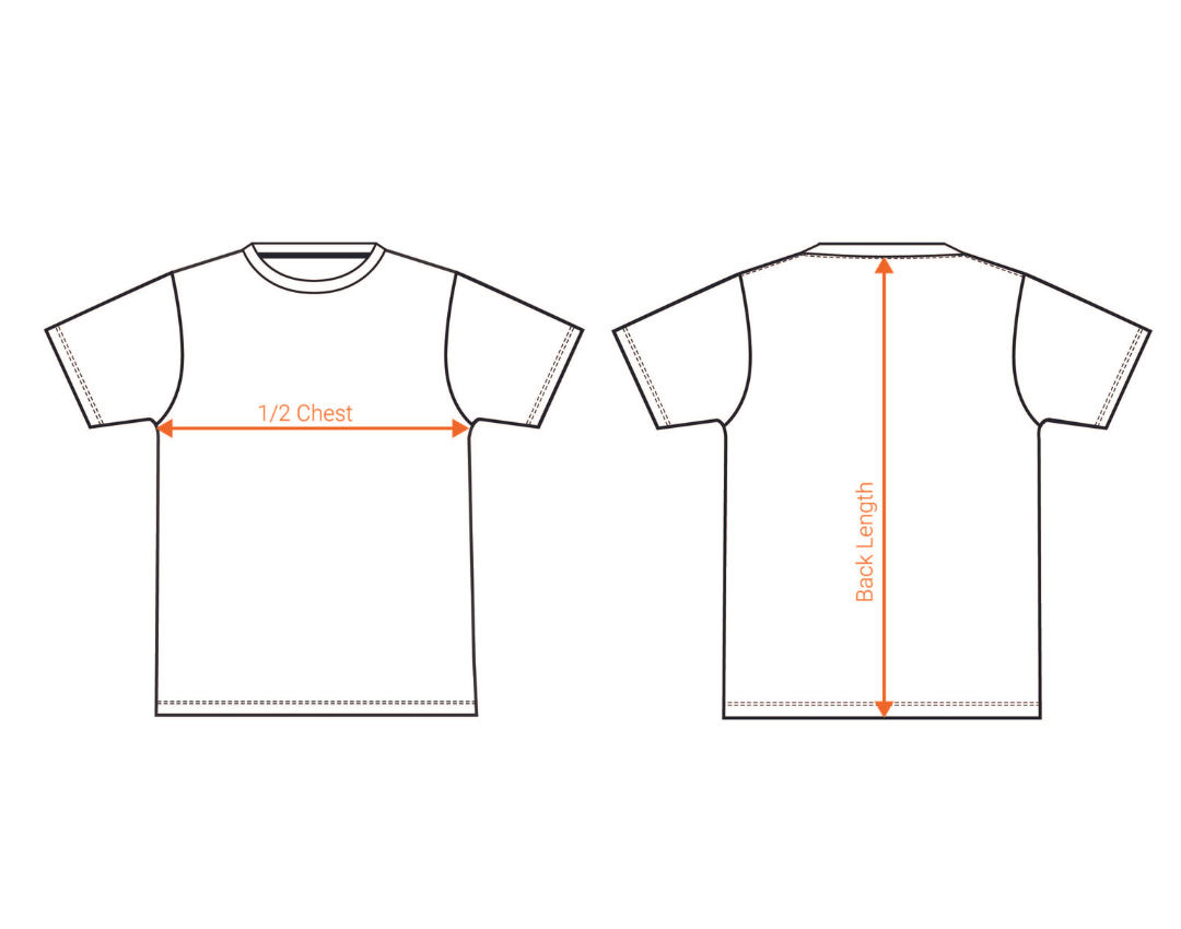 Lay your favourite top/hoodie flat on a solid even surface. Refer to the image below and measure the chest and length. Compare to your desired top layer size chart to find your best fit.